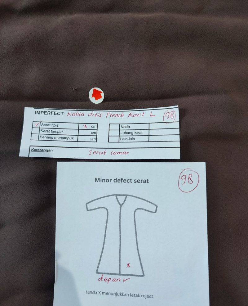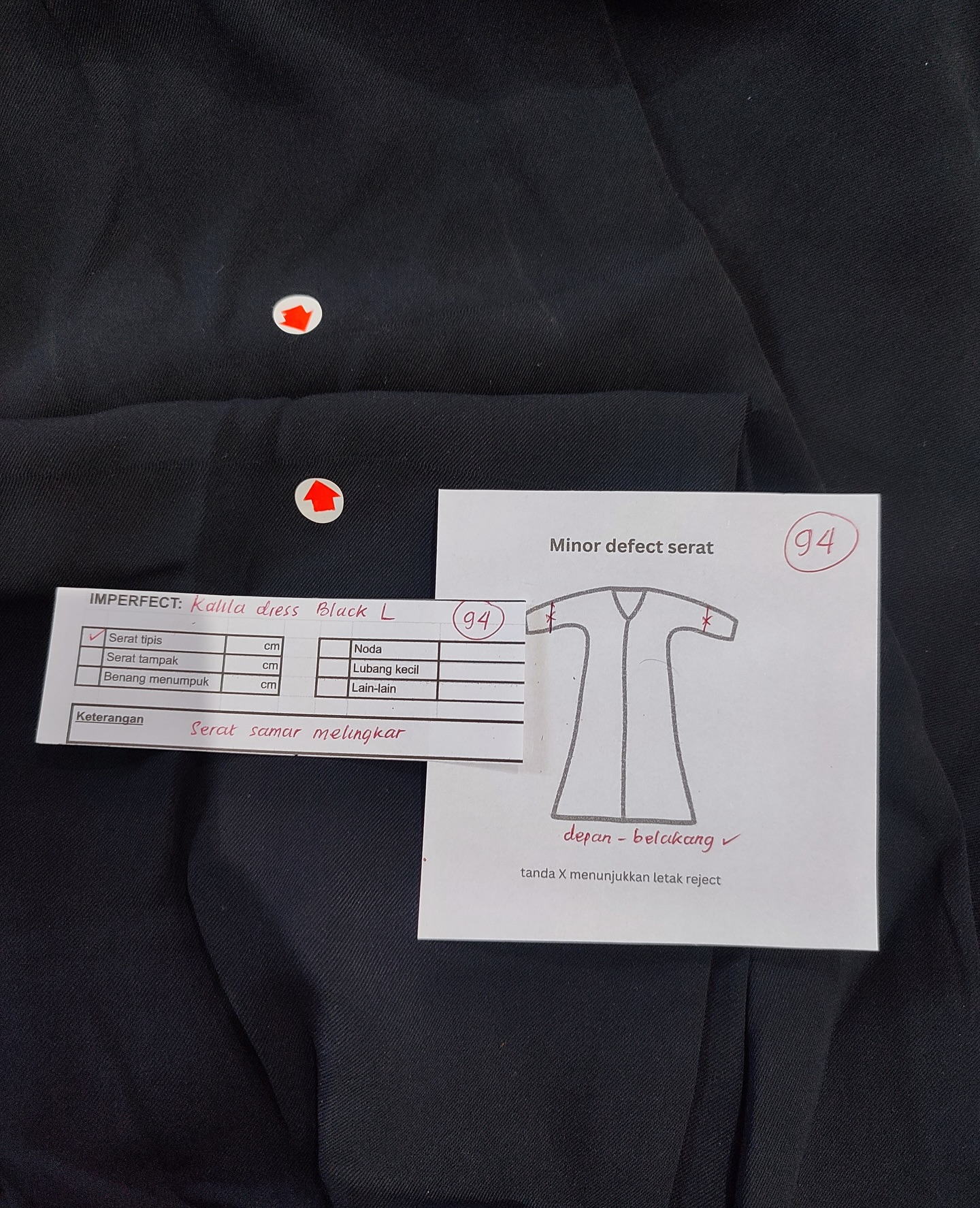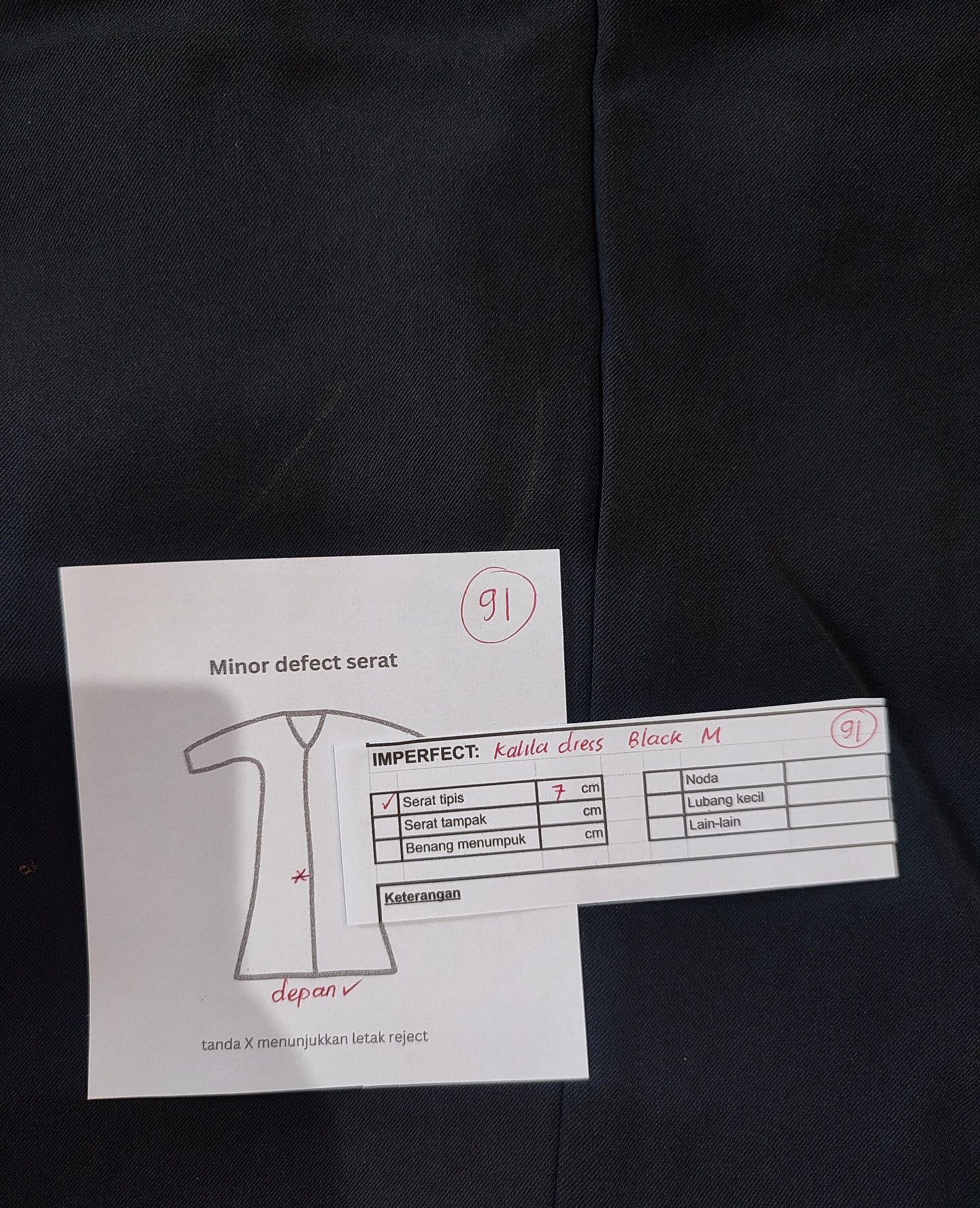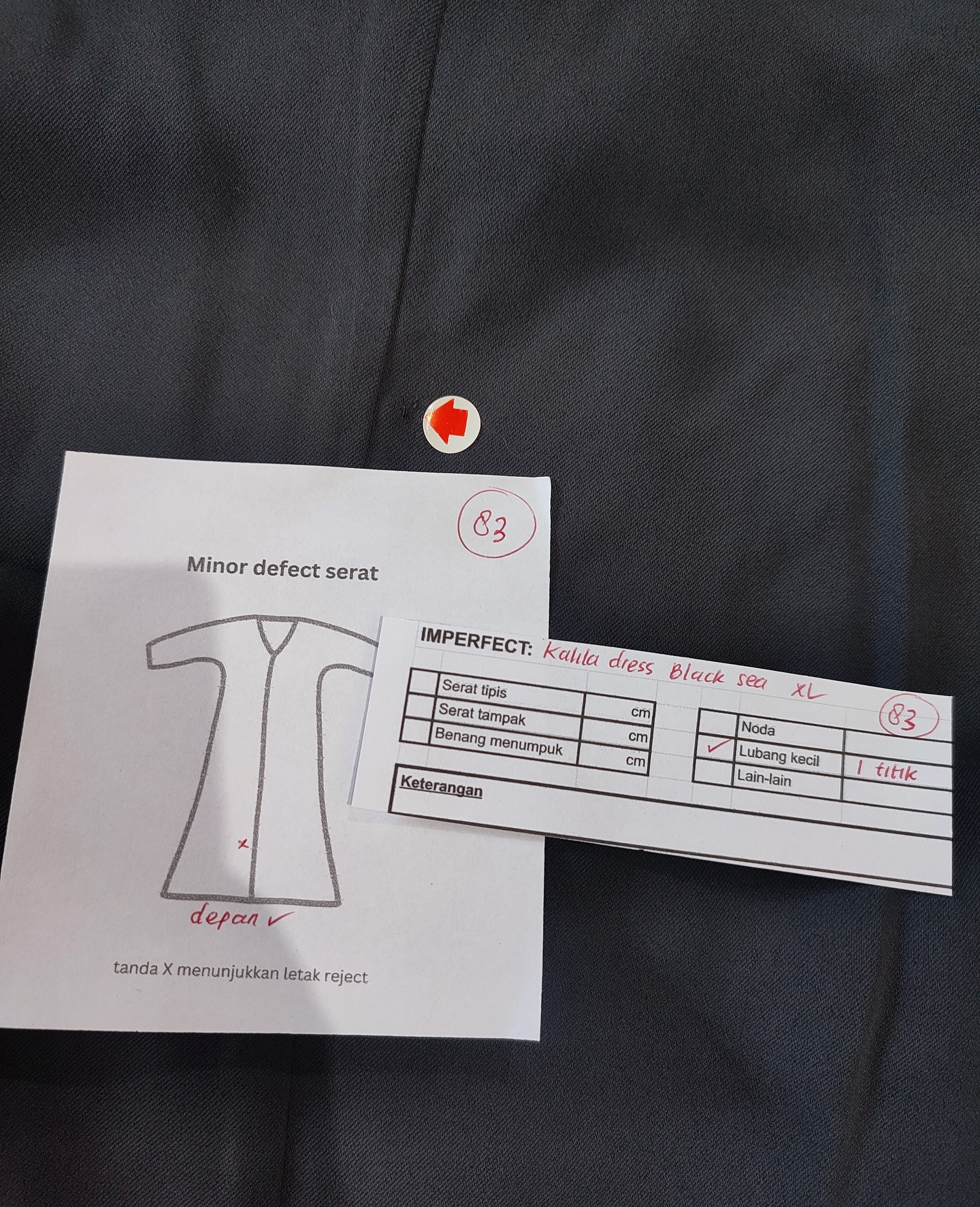 photo includes code, color, size, and defect details.