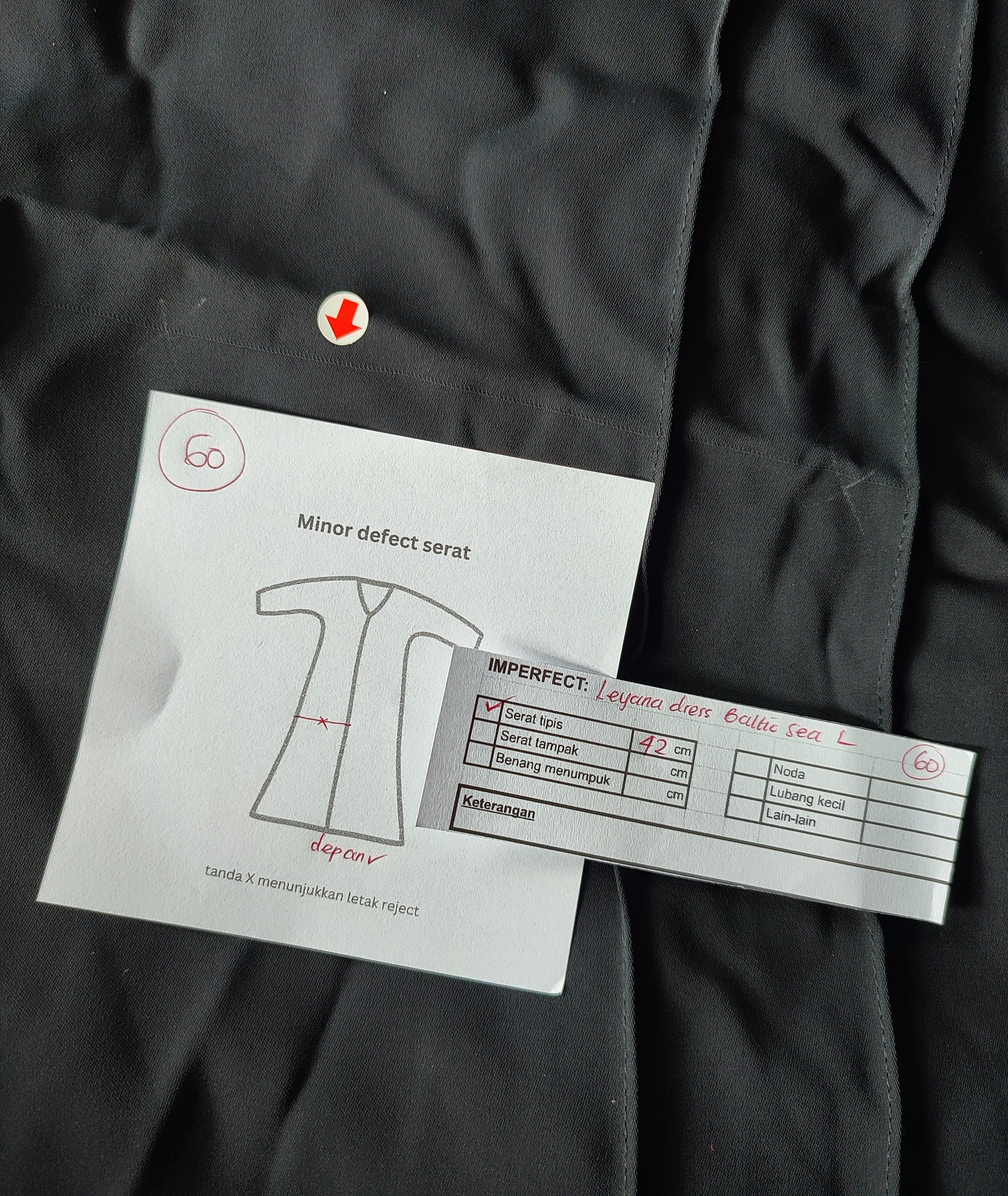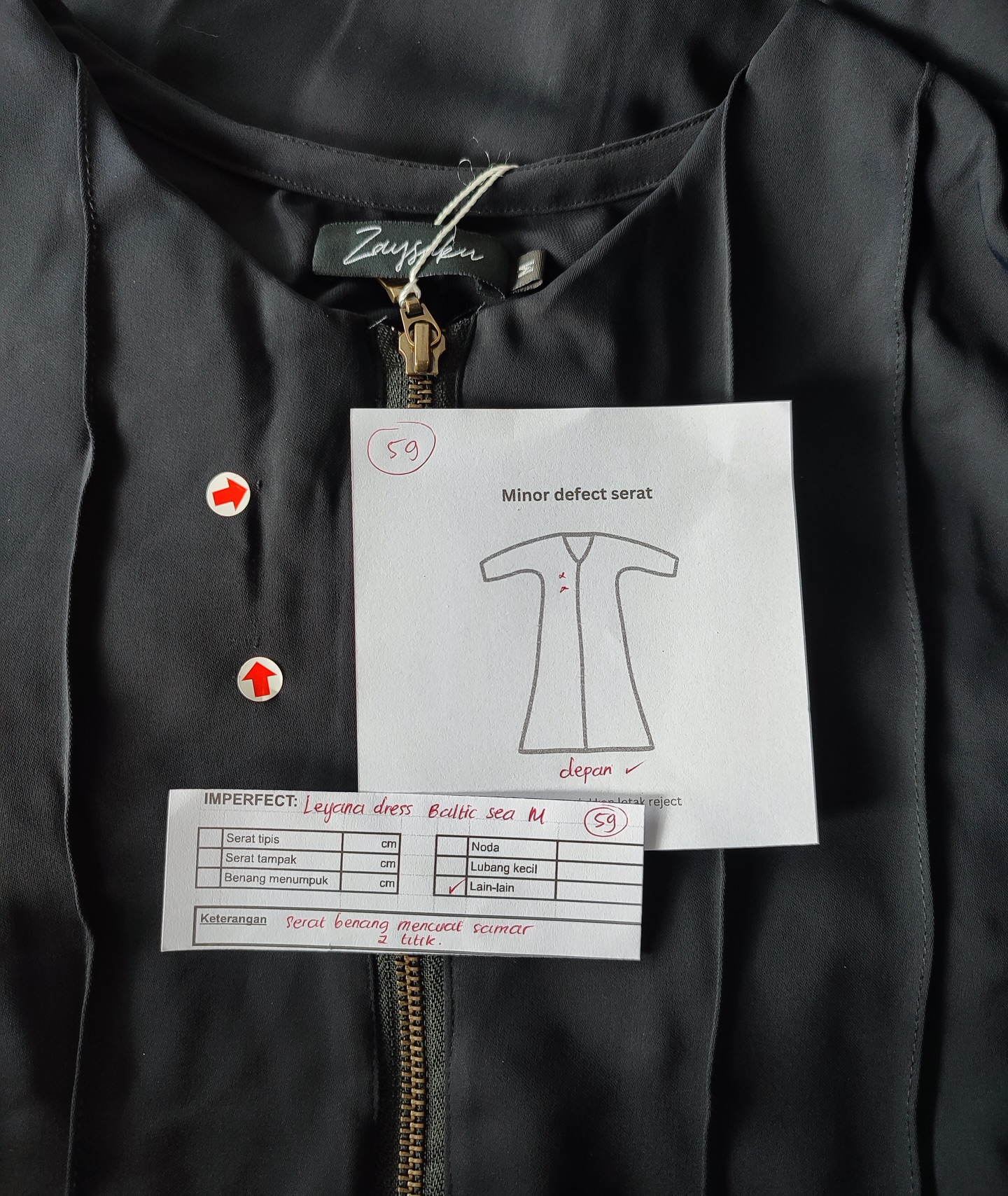 photo includes code, color, size, and defect details.