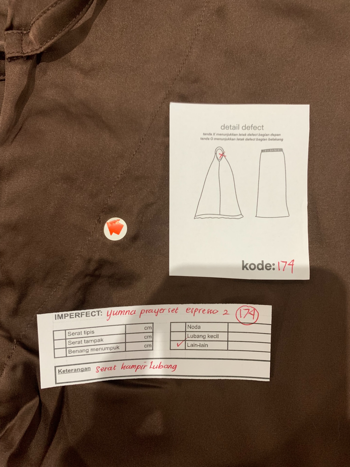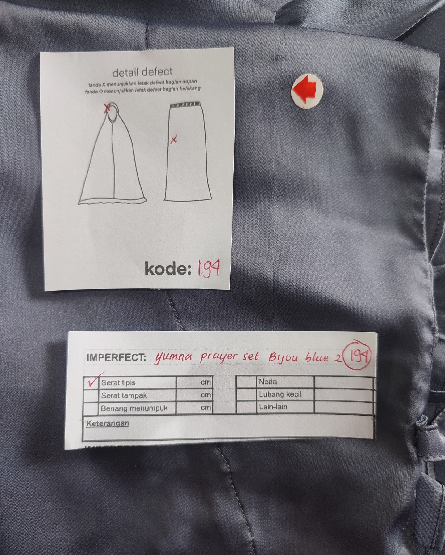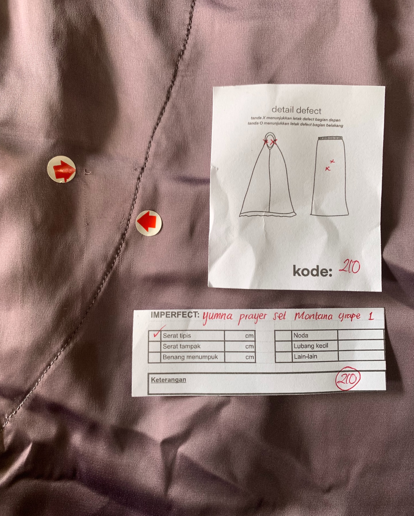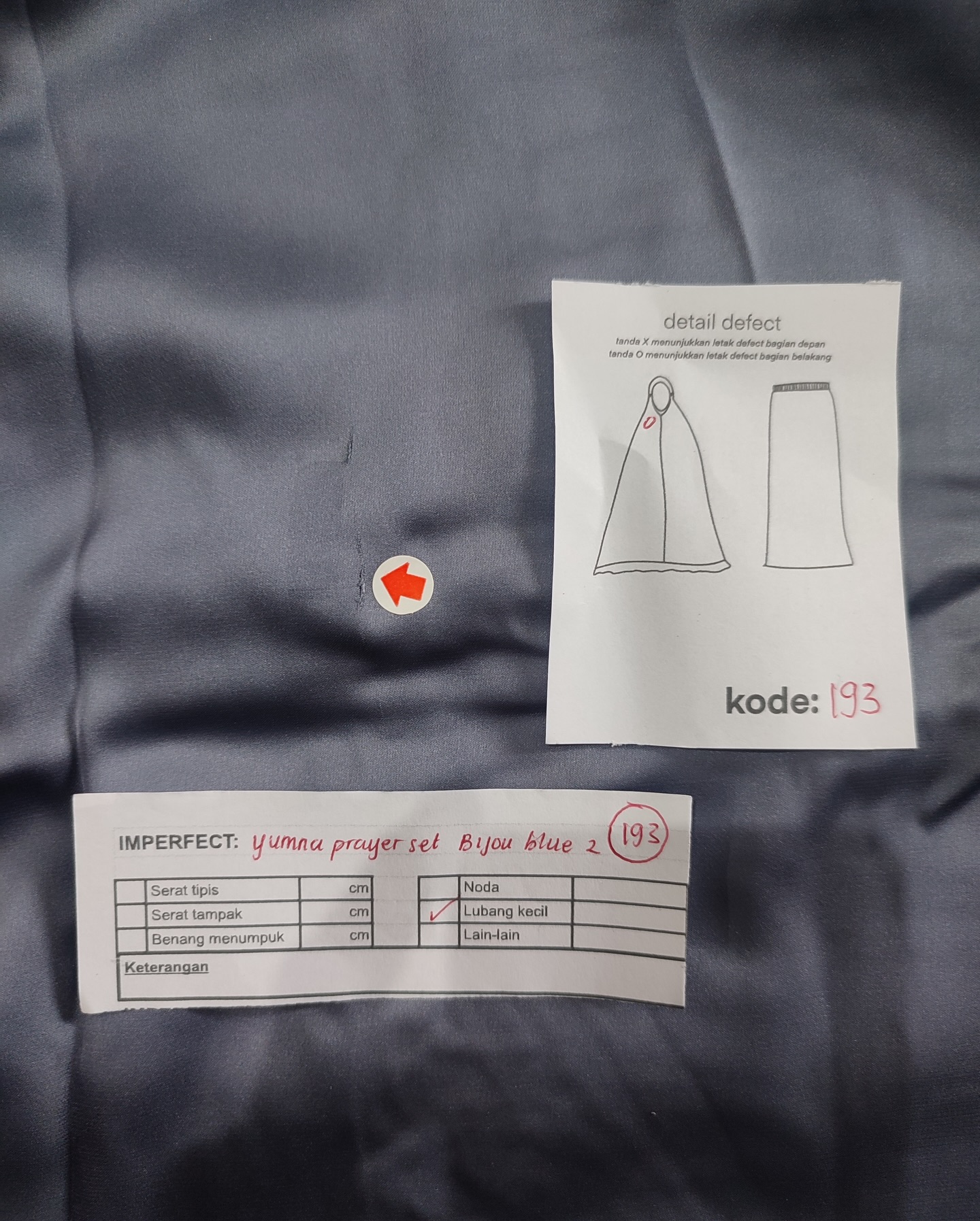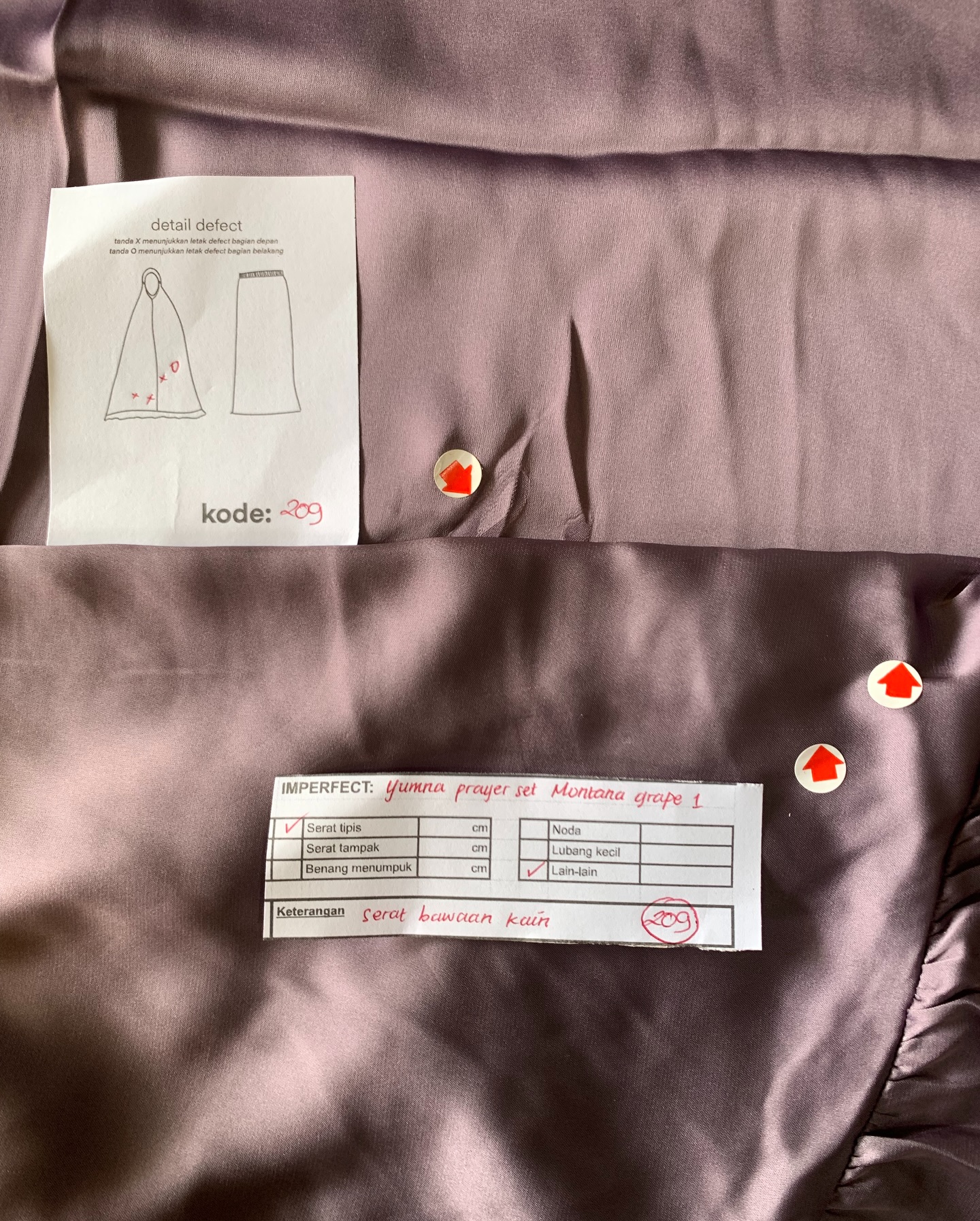 photo includes code, color, size, and defect details.