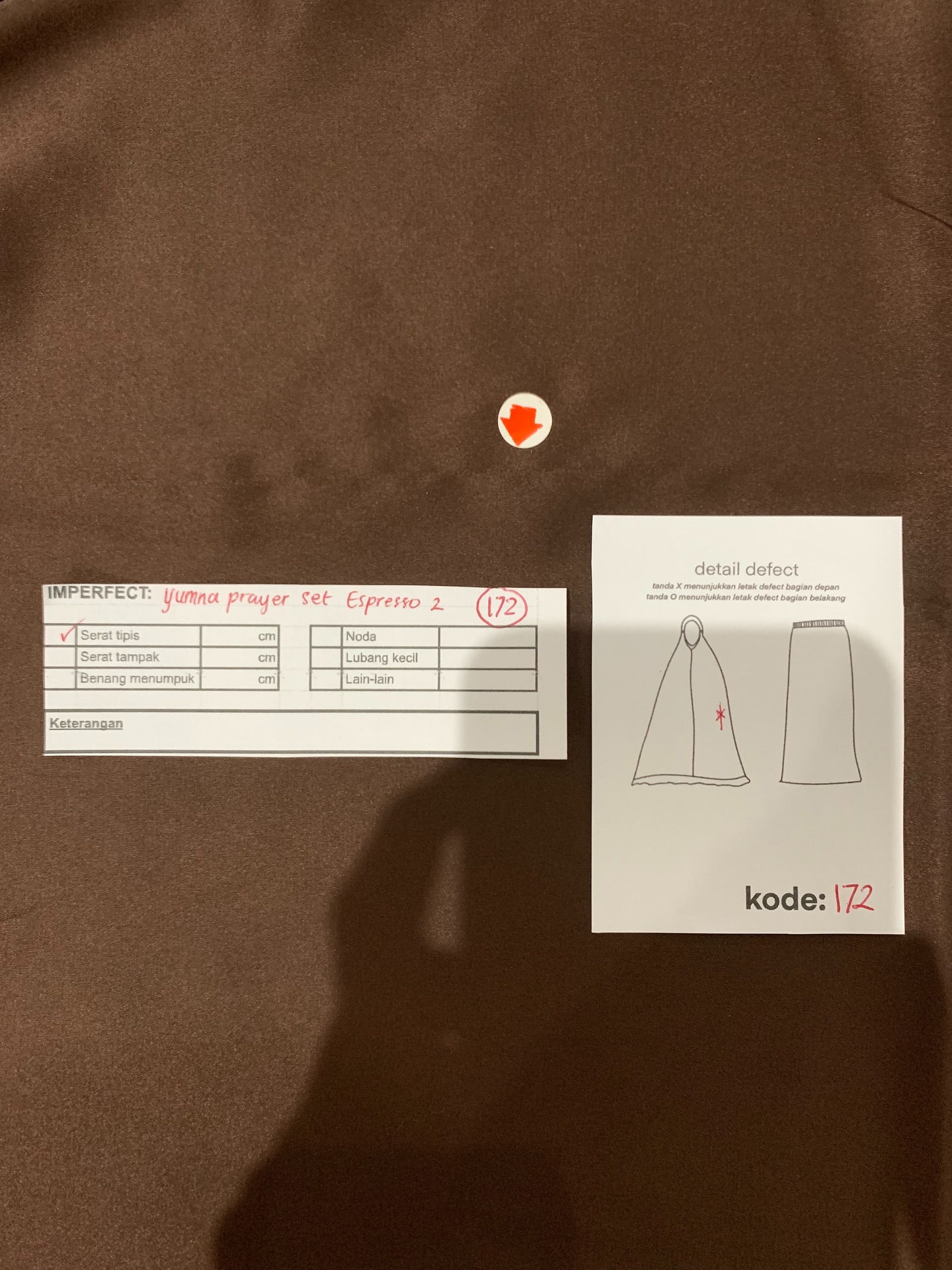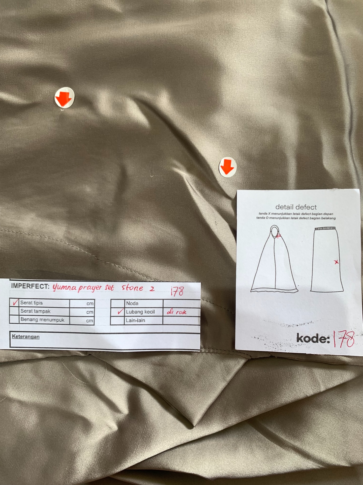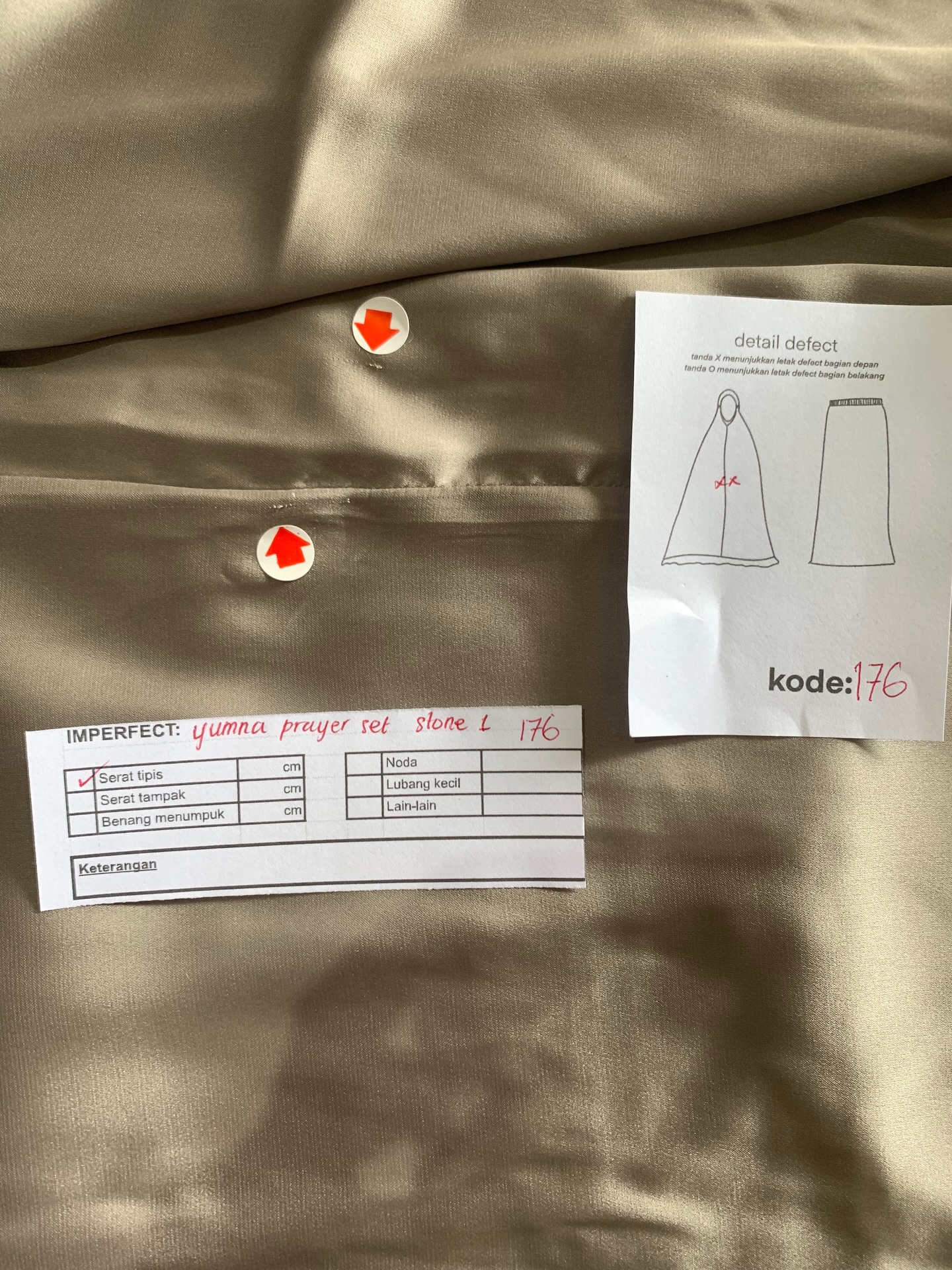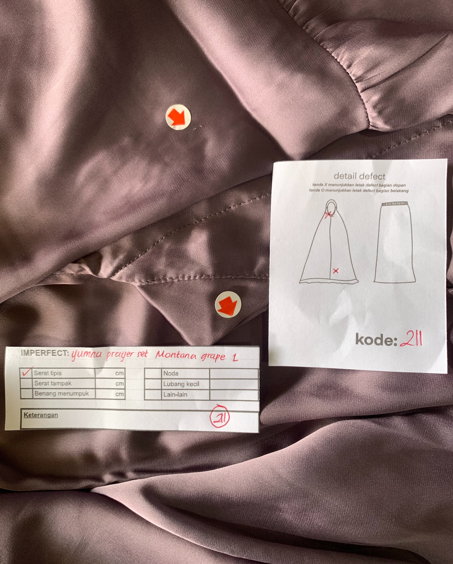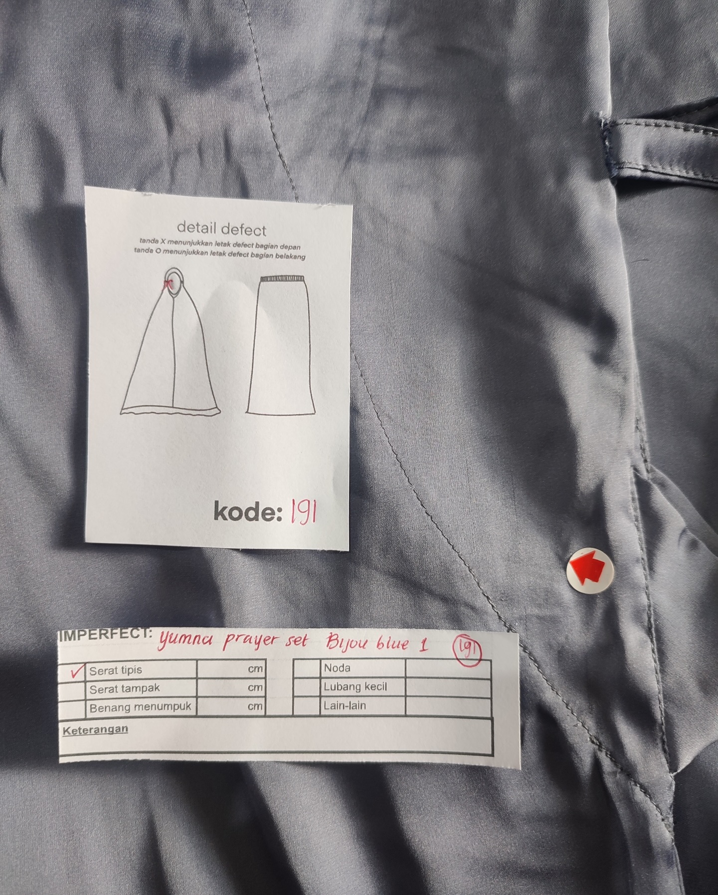 photo includes code, color, size, and defect details.