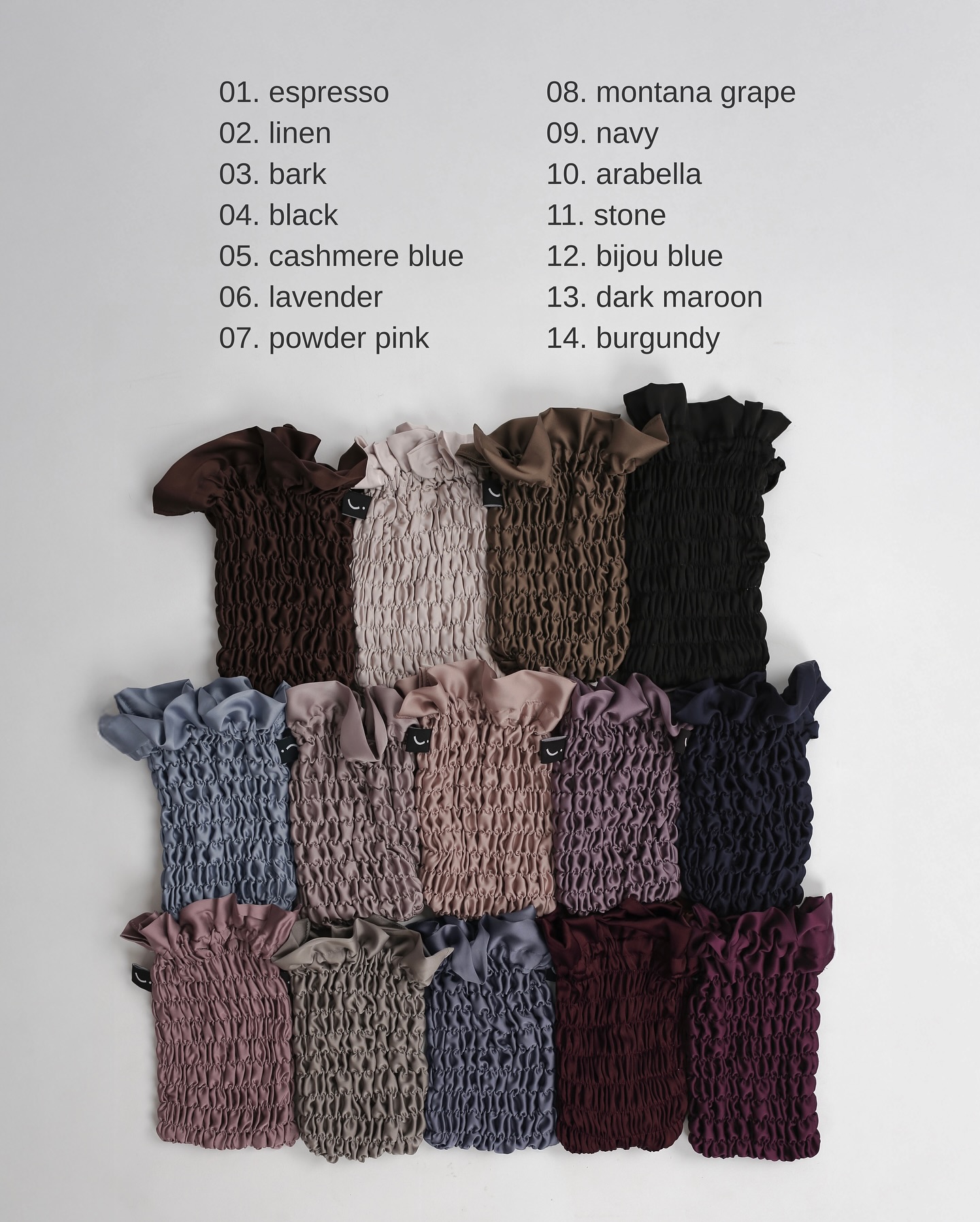 | Warna | espresso, linen, bark, black, cashmere blue, lavender, powder pink, montana grape, navy, arabella, stone, bijou blue, dark maroon, burgundy |